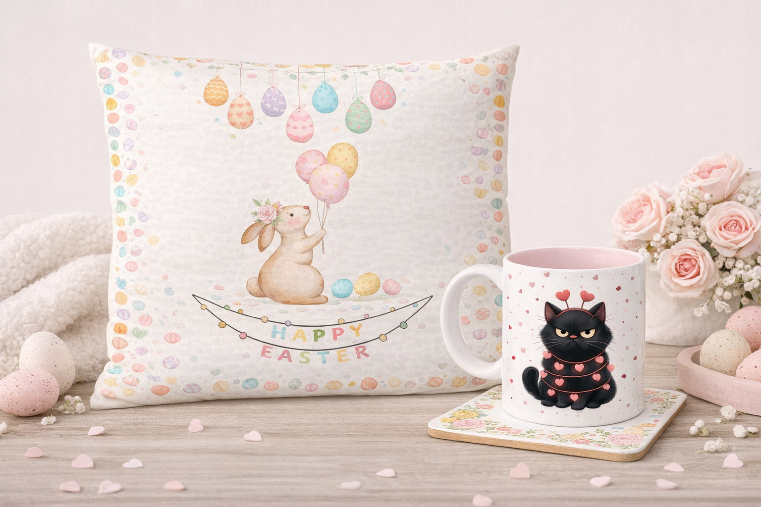 Cozy cushions, charming mugs, and coasters that add comfort and personality to your home.